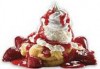 Freshly baked sweet Funnel Cake dusted with Powdered Sugar, surrounded by Strawberries and topped with French Vanilla Ice Cream, Strawberry Puree and Whipped Topping